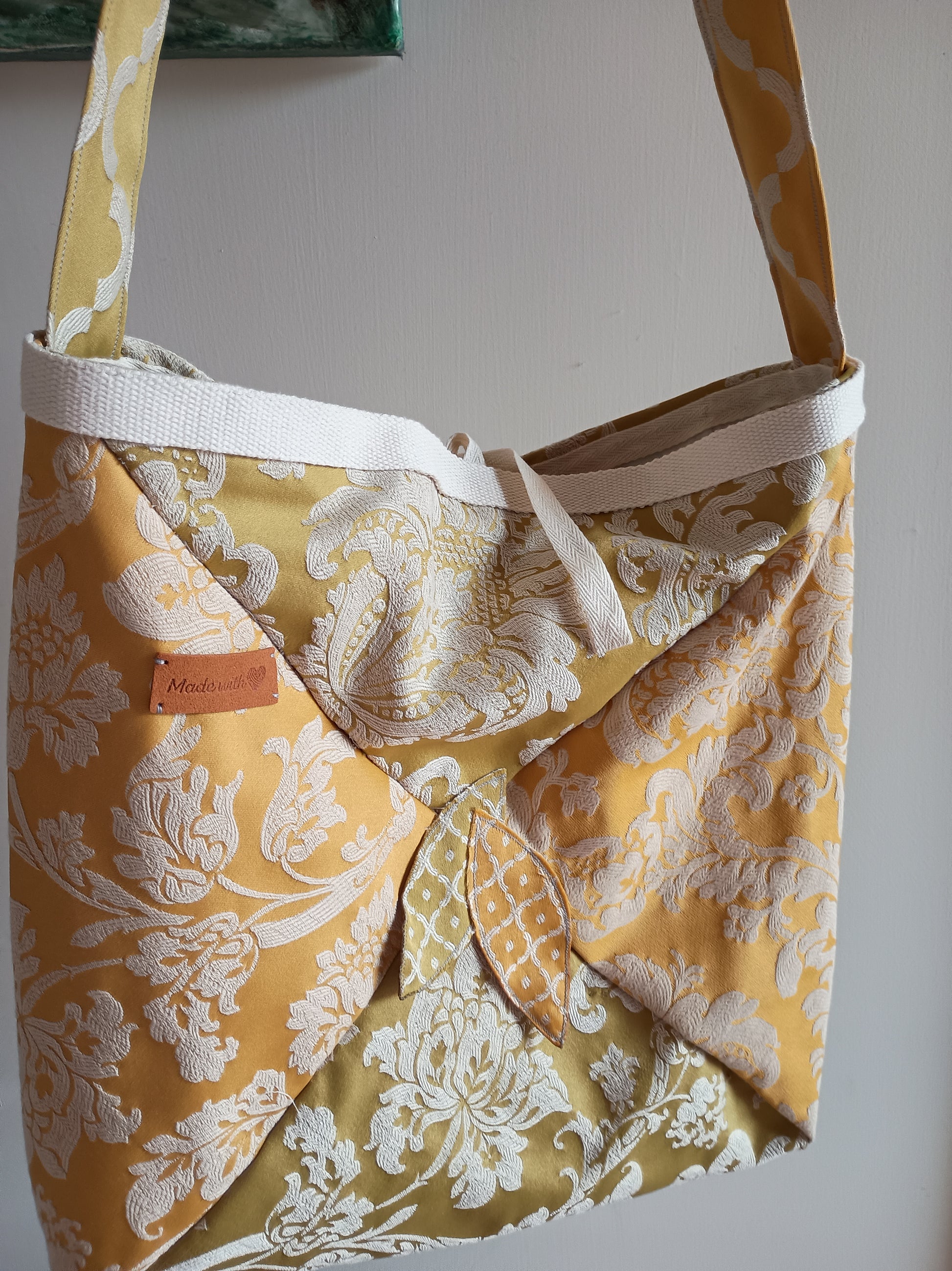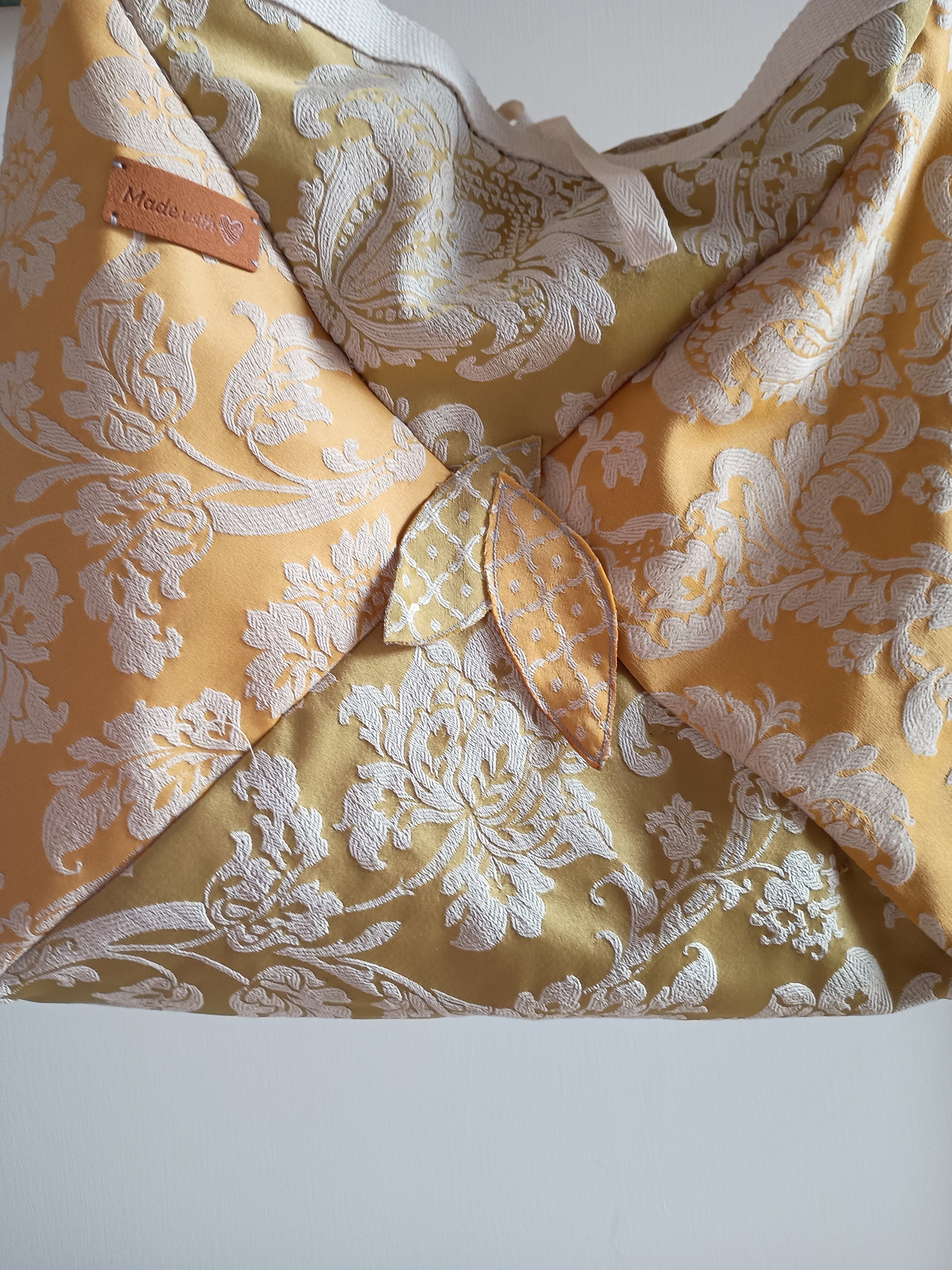 Un modello unico che intreccia eleganza e originalità, realizzato con tessuti d’arredo nuovi ma antichi, recuperati e riportati a nuova vita. La combinazione di giallo oro e verde oliva, impreziosita da motivi floreali in rilievo, richiama il calore dei campi al tramonto.