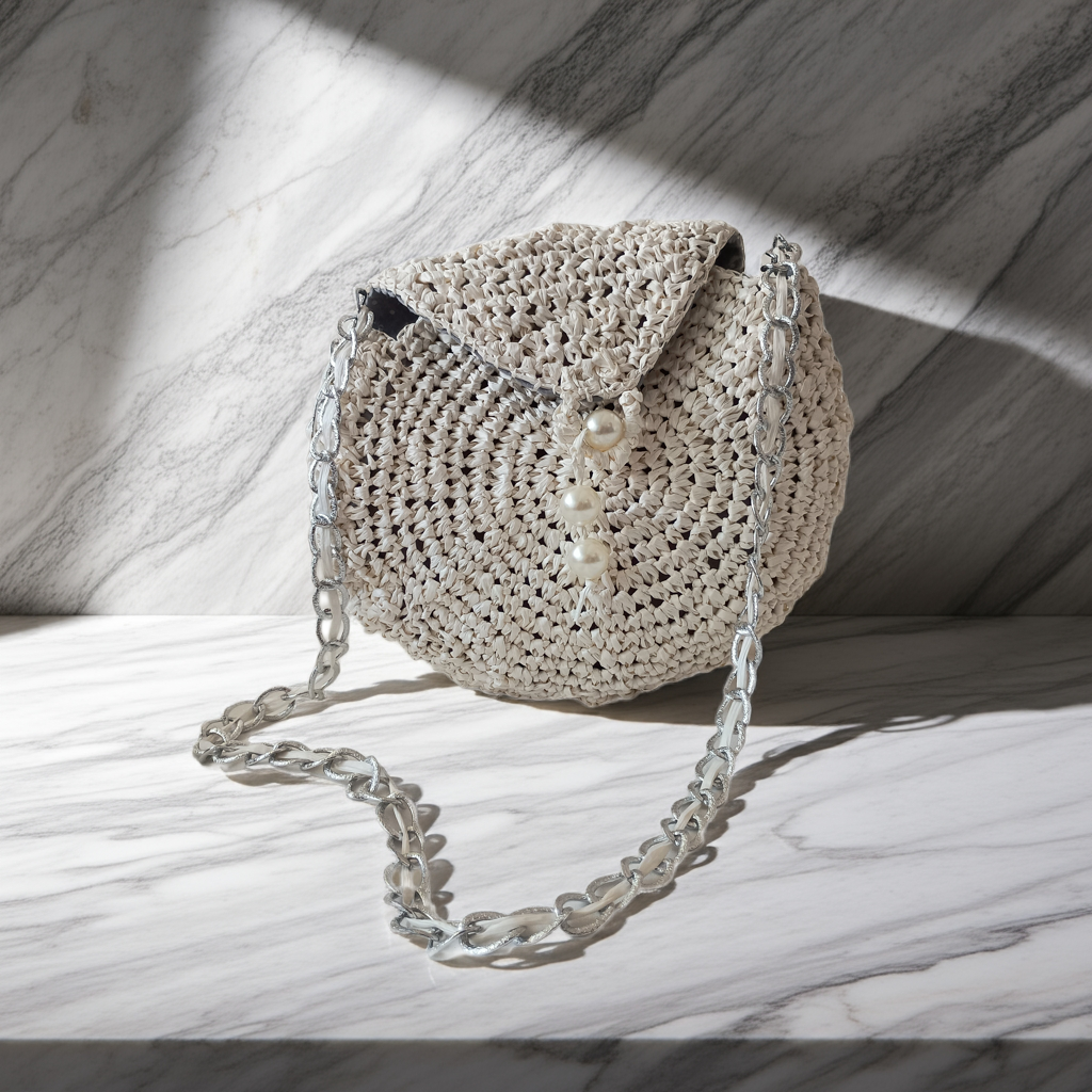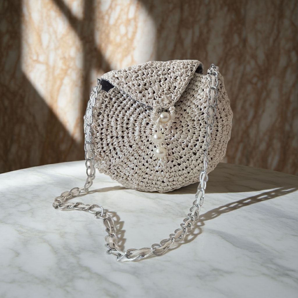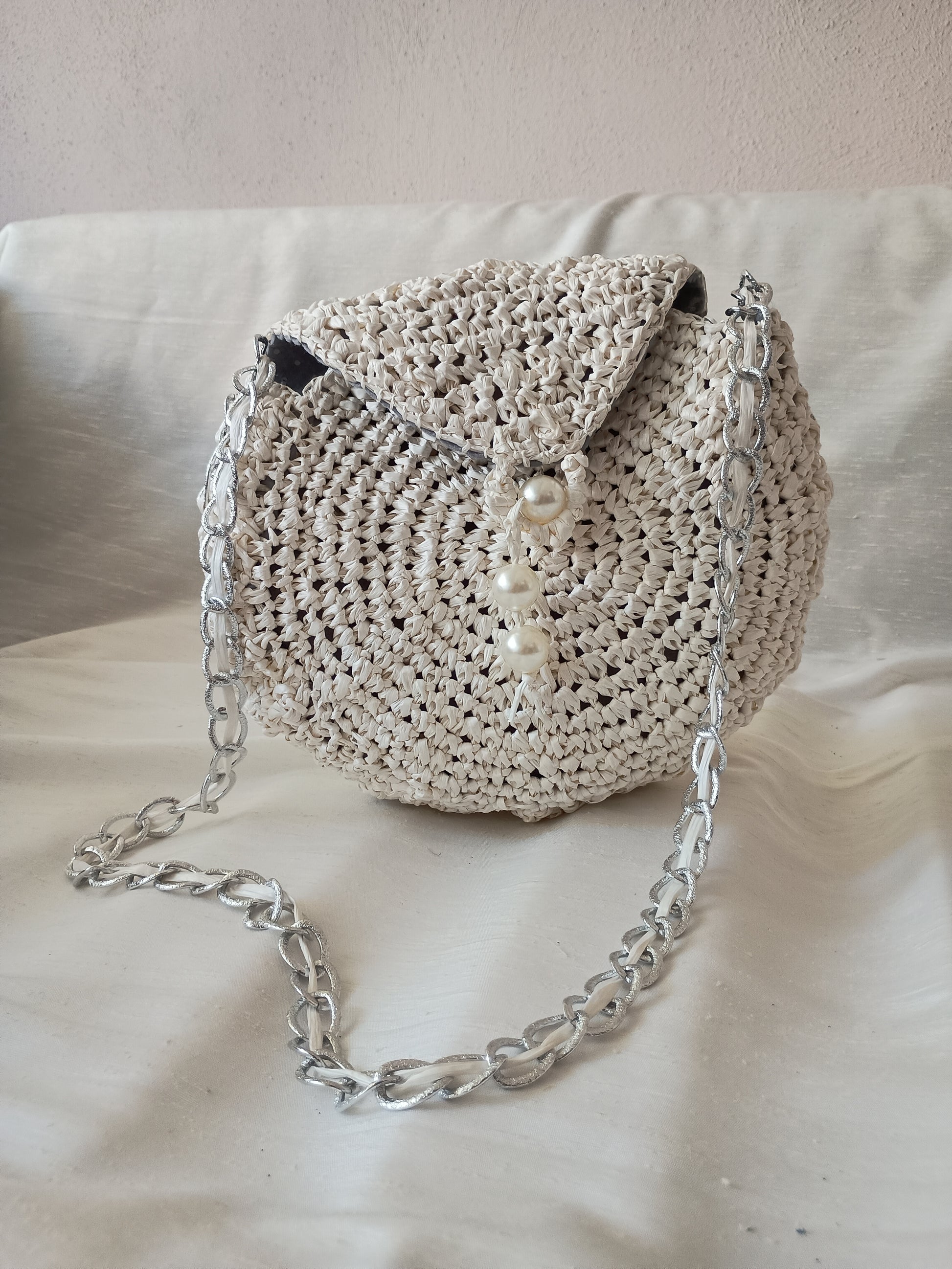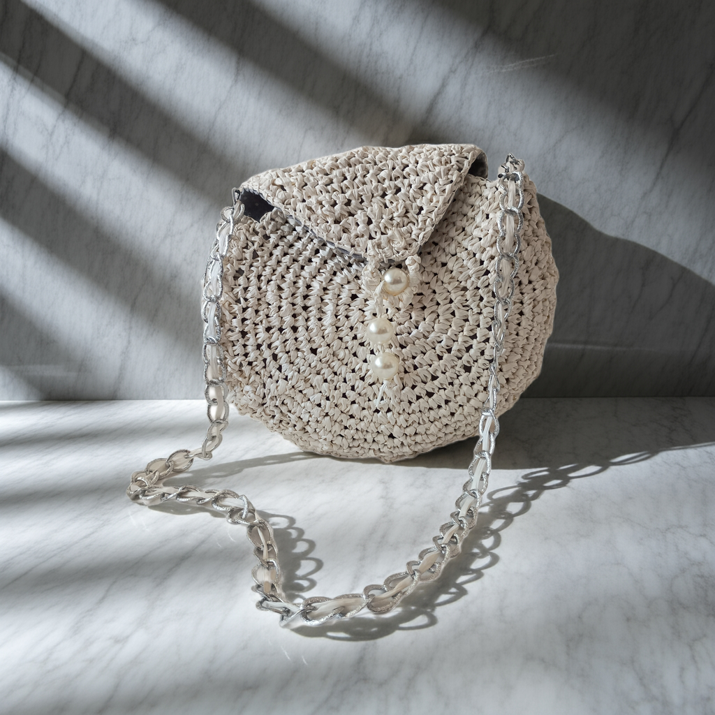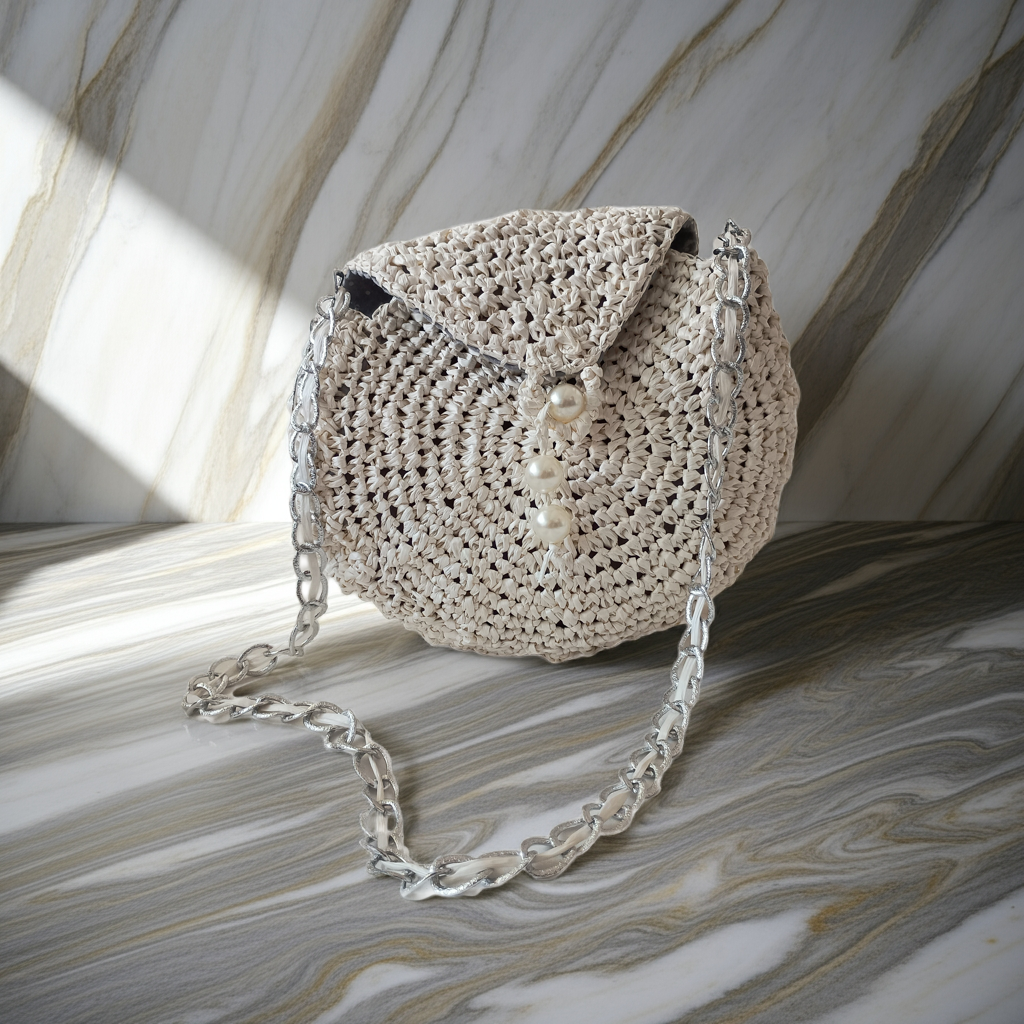 Borsa con un'anima chic e naturale allo stesso tempo: elegante, leggera e raffinata, perfetta per le giornate estive o le serate più speciali. "Perla di Rafia" – Borsa a tracolla fatta a mano